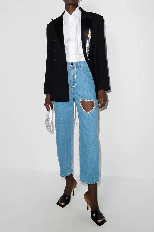 Blue Rhinestone Heart Decor Sweet Jeans