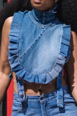 Zig Zag Butterfly Beading Rocking Lace-Up Denim Vest