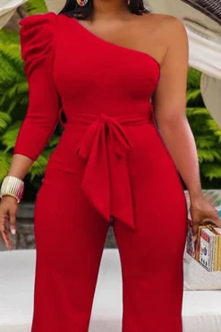 Solid Color One Shoulder Elegant Jumpsuit Wih Belt