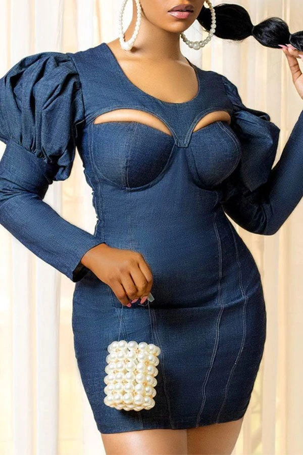 Solid Color Unique Puff Sleeve Cutout Mini Dress